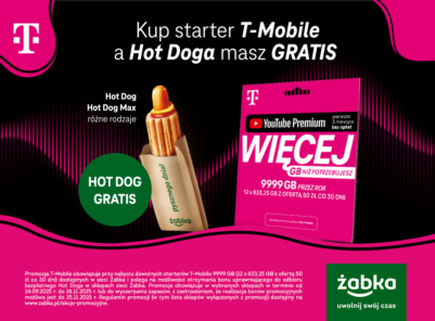 Kup dowolny starter T-Mobile z ofertą 9999 GB dostępny w sieci Żabka a otrzymasz bon towarowy, który możesz zrealizować na Hot Doga w Żabce