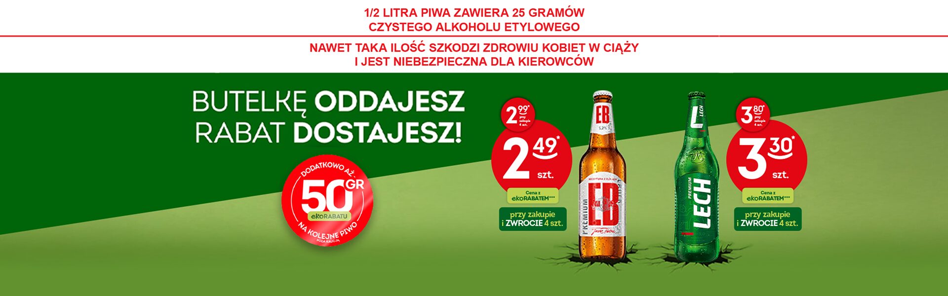 Dostajesz ekorabat na 3 nowo zakupione piwa, razem 1,50 zł – po 0,50 zł za pustą butelkę zwrotną. Kaucja za 3 nowo zakupione piwa jest rozliczana w ramach wymiany butelek. Na pozostałe 3 nowo zakupione piwa nie otrzymujesz rabatu oraz musisz opłacić kaucję za butelki według ogólnych zasad. Zakup musi odbyć się na tym samym paragonie.